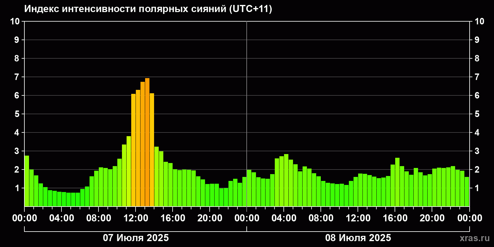 Изменения индекса интенсивности полярных сияний с 2025-07-07 по 2025-07-08 по местному времени
