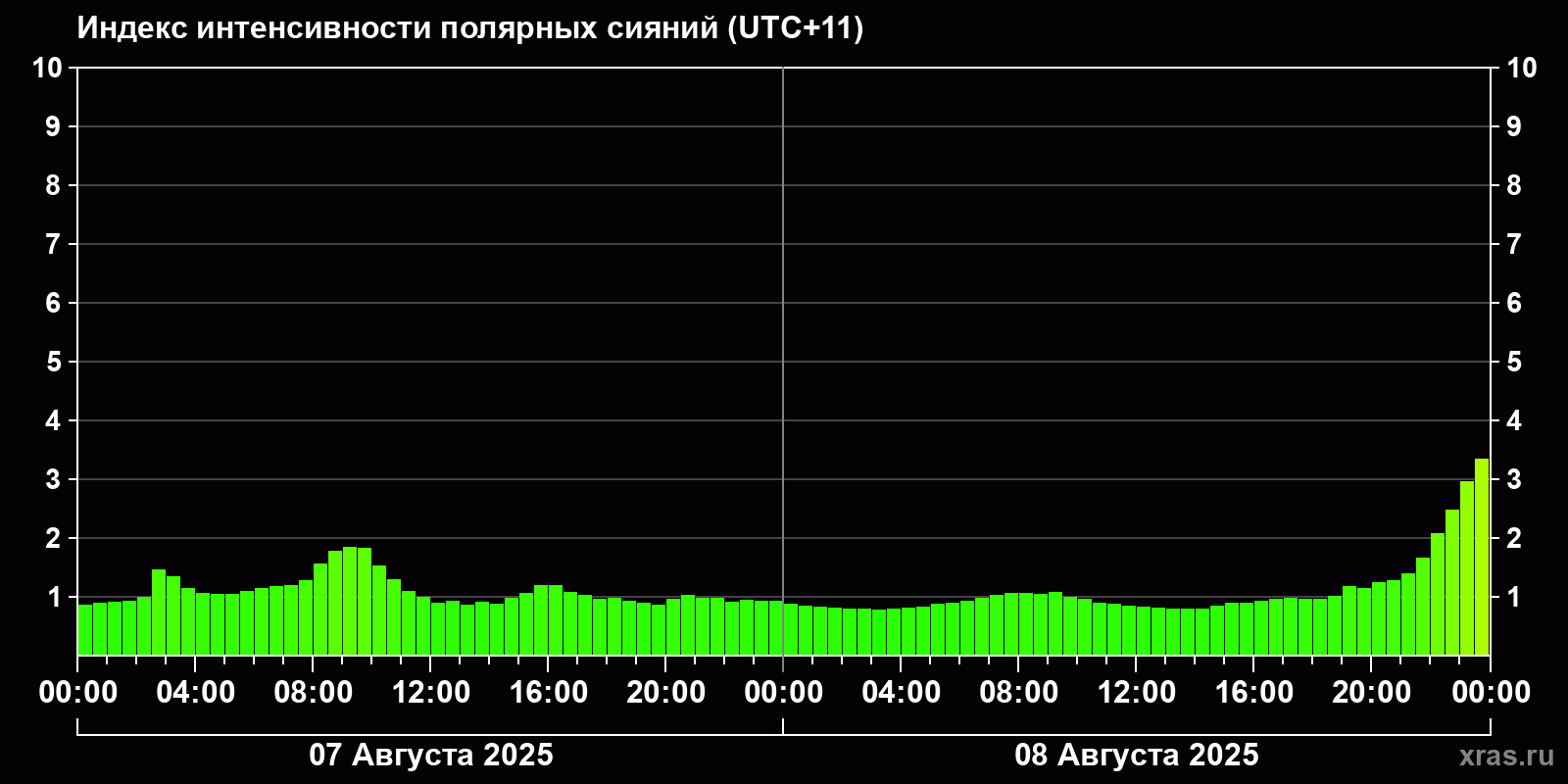 Изменения индекса интенсивности полярных сияний с 2025-08-07 по 2025-08-08 по местному времени