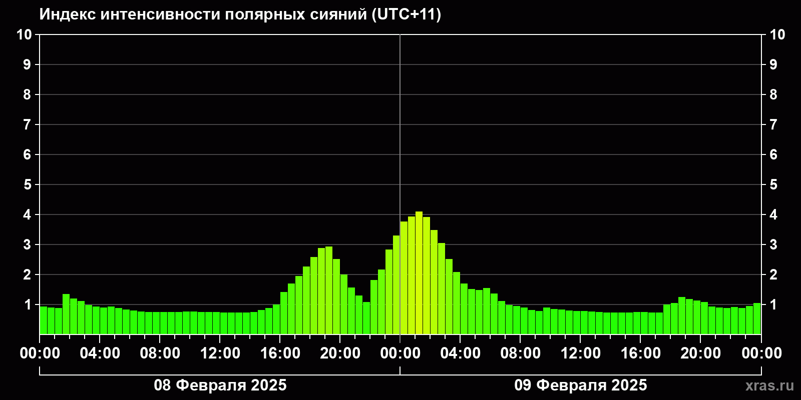 Изменения индекса интенсивности полярных сияний с 2025-02-08 по 2025-02-09 по местному времени