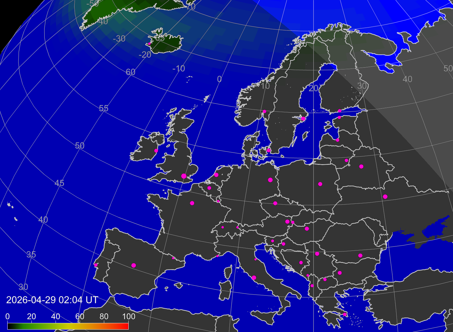 Вероятность полярных сияний в городах Европы