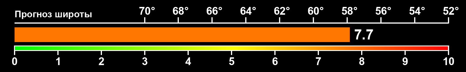 Индекс интенсивности полярных сияний и теоретически возможная широта наблюдений для ночного времени в восточном полушарии по состоянию на 2026-01-11 23:51 (конец дня) по местному времени