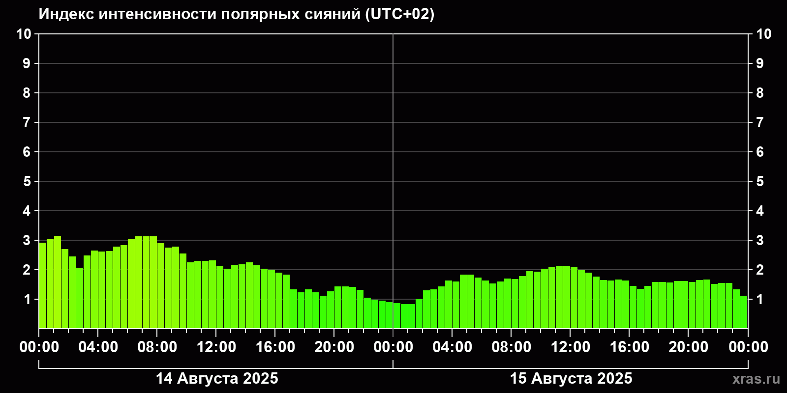 Изменения индекса интенсивности полярных сияний с 2025-08-14 по 2025-08-15 по местному времени