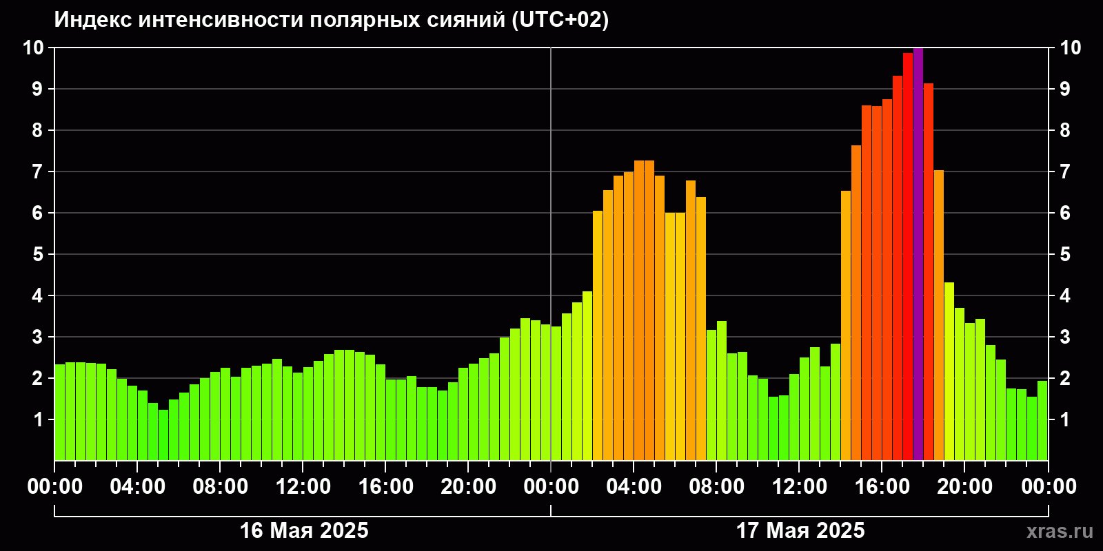 Изменения индекса интенсивности полярных сияний с 2025-05-16 по 2025-05-17 по местному времени