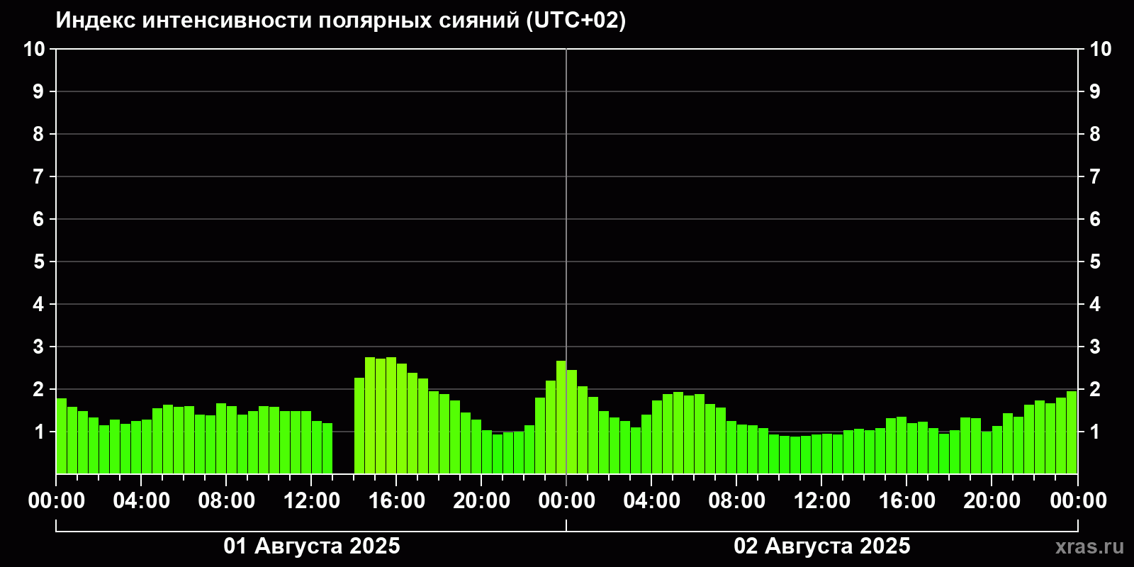 Изменения индекса интенсивности полярных сияний с 2025-08-01 по 2025-08-02 по местному времени