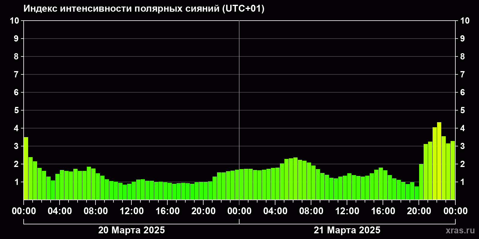 Изменения индекса интенсивности полярных сияний с 2025-03-20 по 2025-03-21 по местному времени