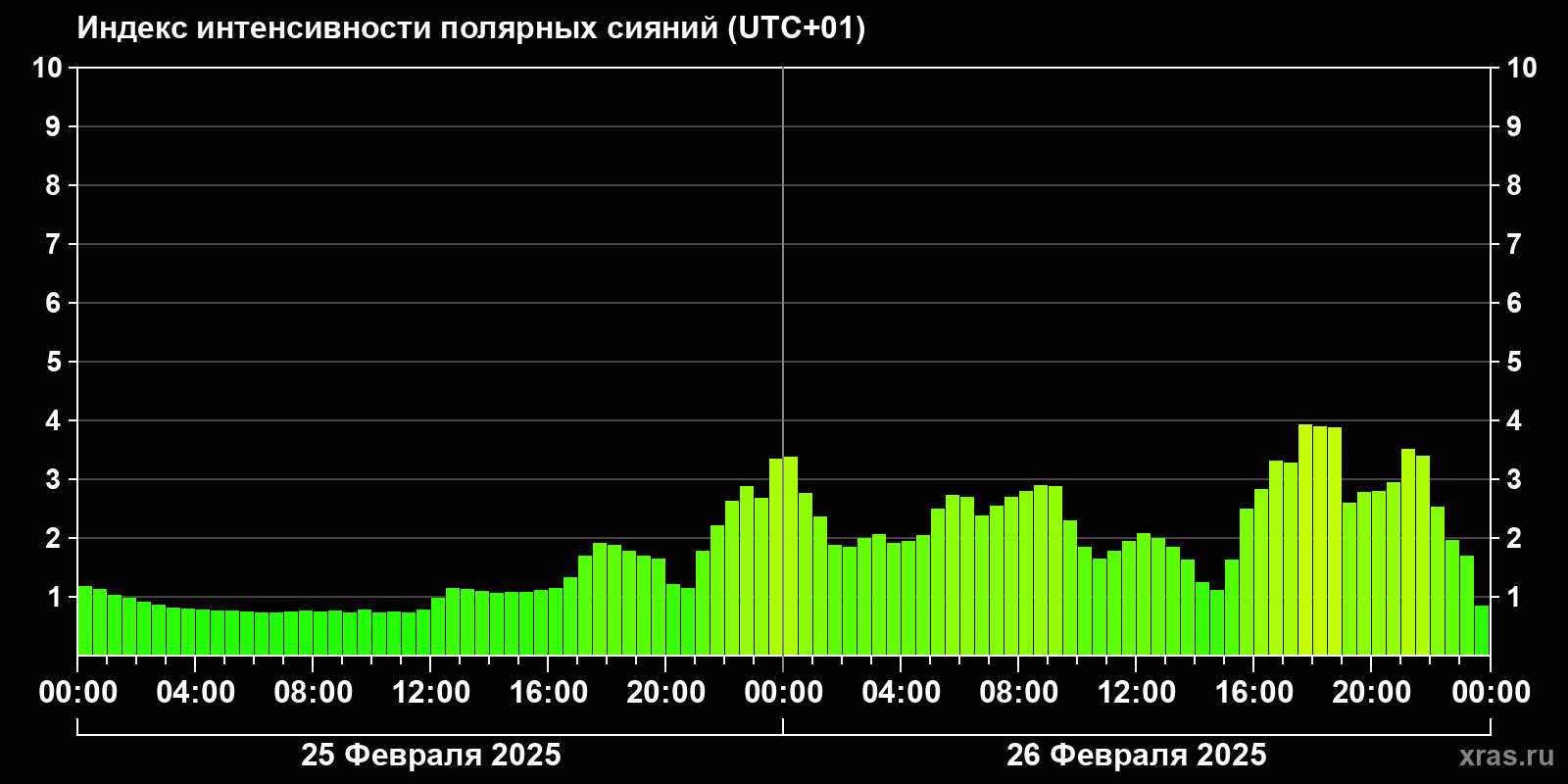 Изменения индекса интенсивности полярных сияний с 2025-02-25 по 2025-02-26 по местному времени