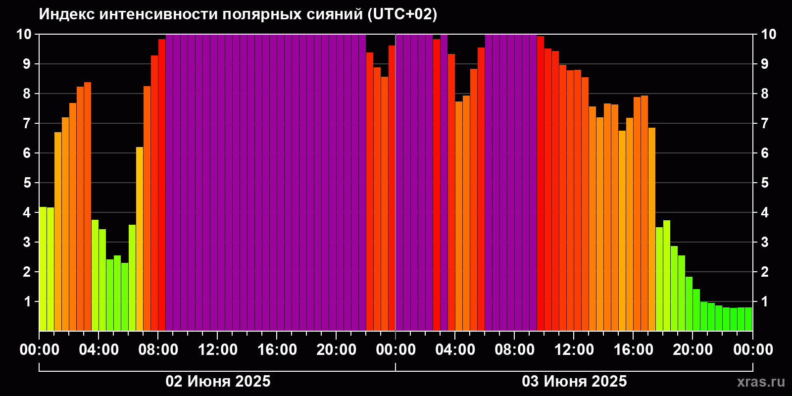 Изменения индекса интенсивности полярных сияний с 2025-06-02 по 2025-06-03 по местному времени