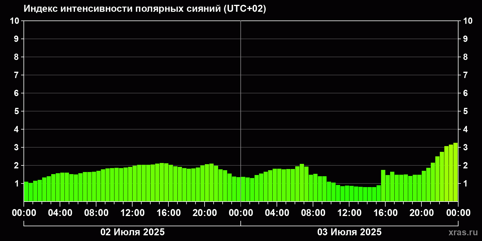 Изменения индекса интенсивности полярных сияний с 2025-07-02 по 2025-07-03 по местному времени