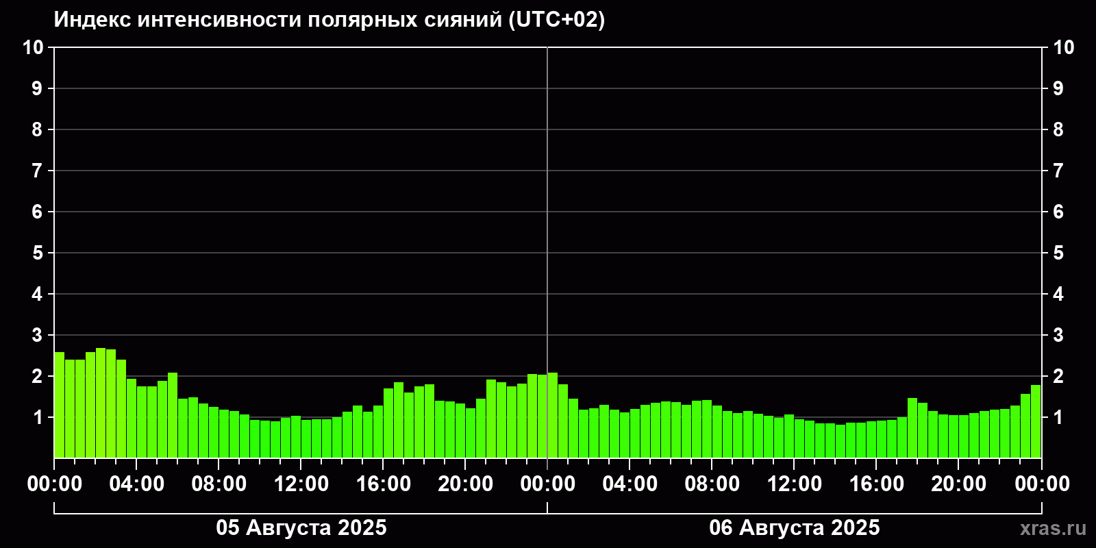 Изменения индекса интенсивности полярных сияний с 2025-08-05 по 2025-08-06 по местному времени