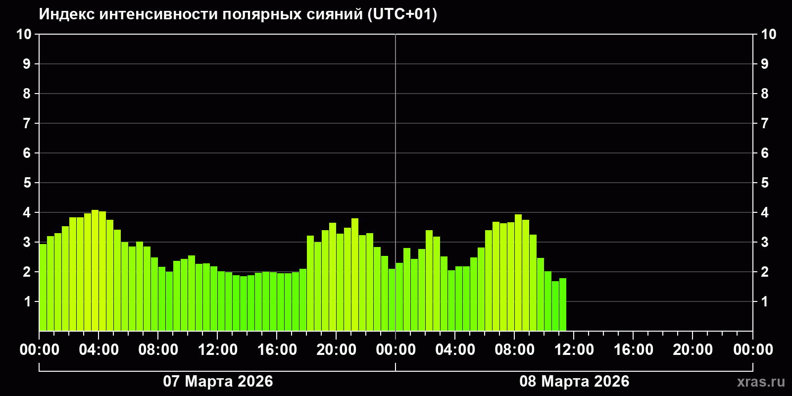 Изменения индекса интенсивности полярных сияний с 2026-03-07 по 2026-03-08 по местному времени