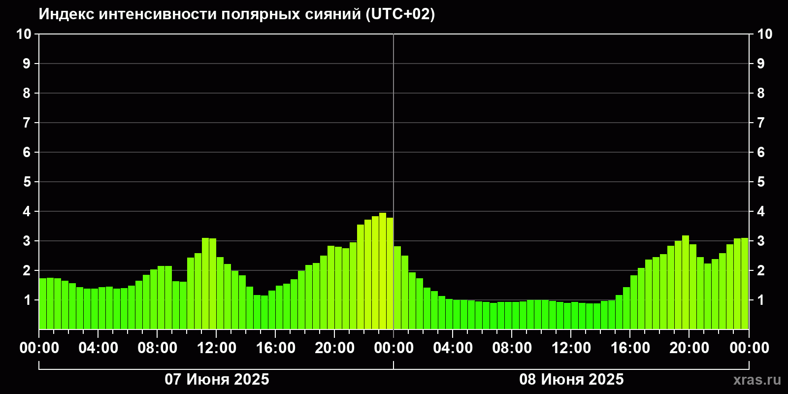 Изменения индекса интенсивности полярных сияний с 2025-06-07 по 2025-06-08 по местному времени