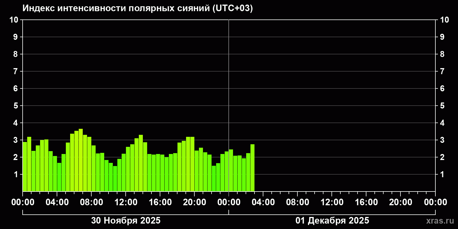 Изменения индекса интенсивности полярных сияний с 2025-11-30 по 2025-12-01 по местному времени