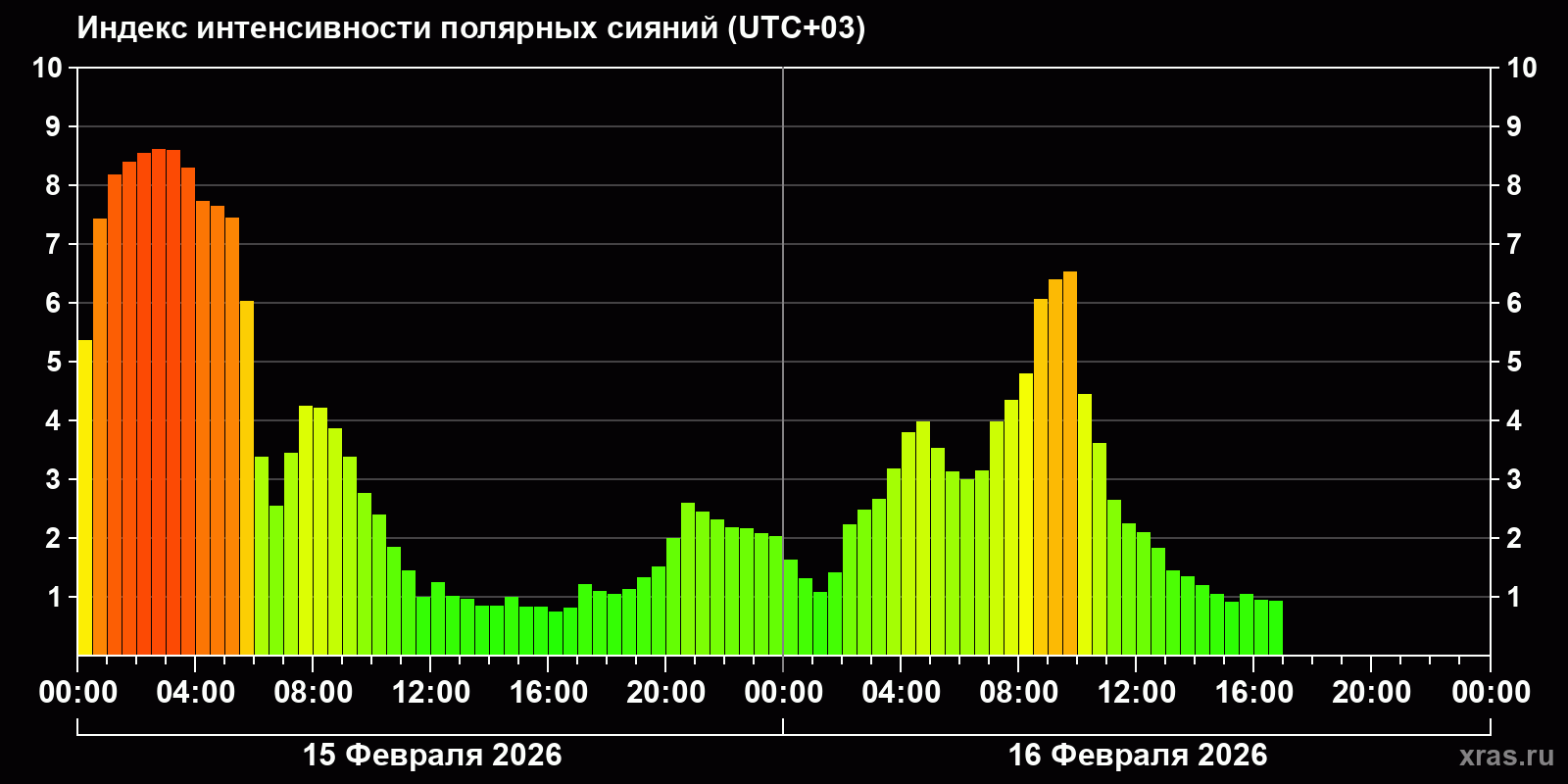 Изменения индекса интенсивности полярных сияний с 2026-02-15 по 2026-02-16 по местному времени
