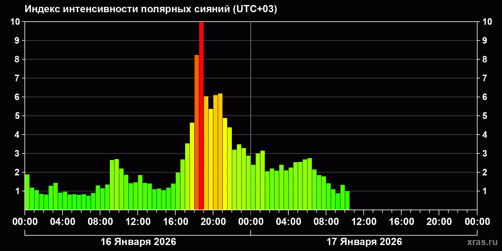 Изменения индекса интенсивности полярных сияний с 2026-01-16 по 2026-01-17 по местному времени
