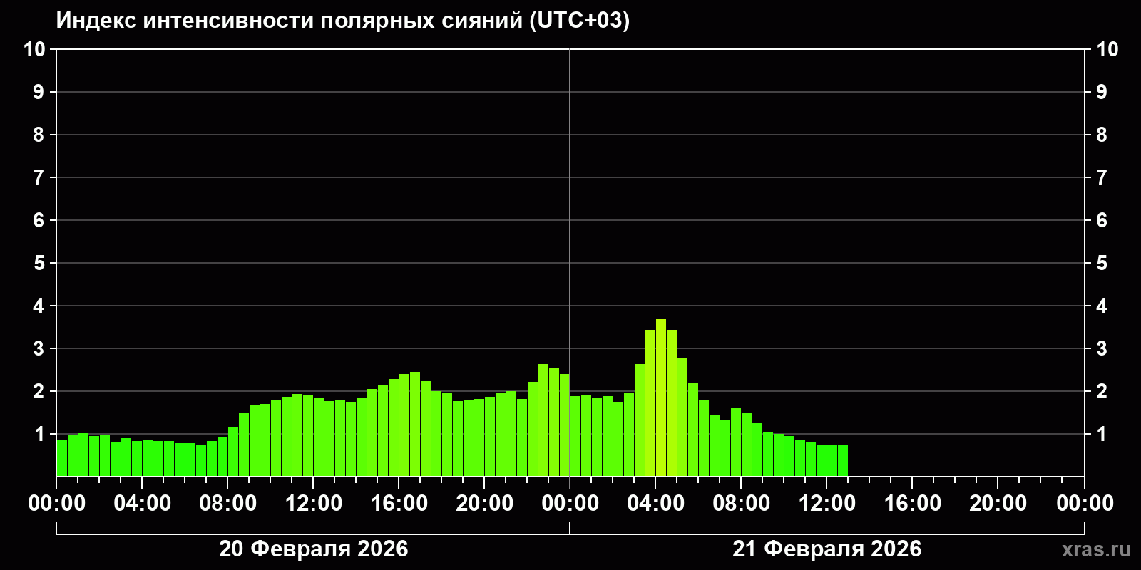 Изменения индекса интенсивности полярных сияний с 2026-02-20 по 2026-02-21 по местному времени