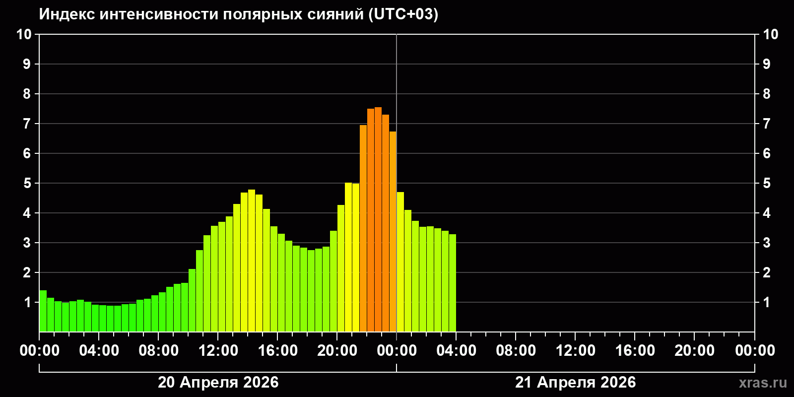 Изменения индекса интенсивности полярных сияний с 2026-04-20 по 2026-04-21 по местному времени