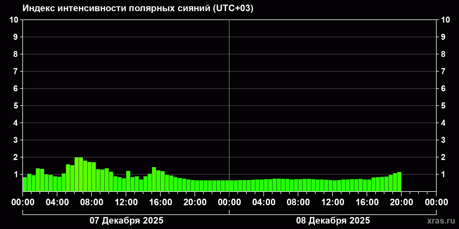 Изменения индекса интенсивности полярных сияний с 2025-12-07 по 2025-12-08 по местному времени