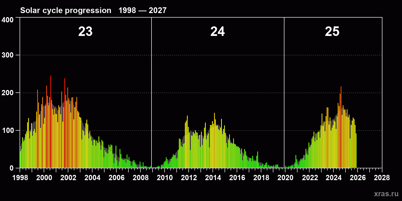 Average monthly sunspot number (SSN) from 1998, January to the present. Gray background - average solar cycle.