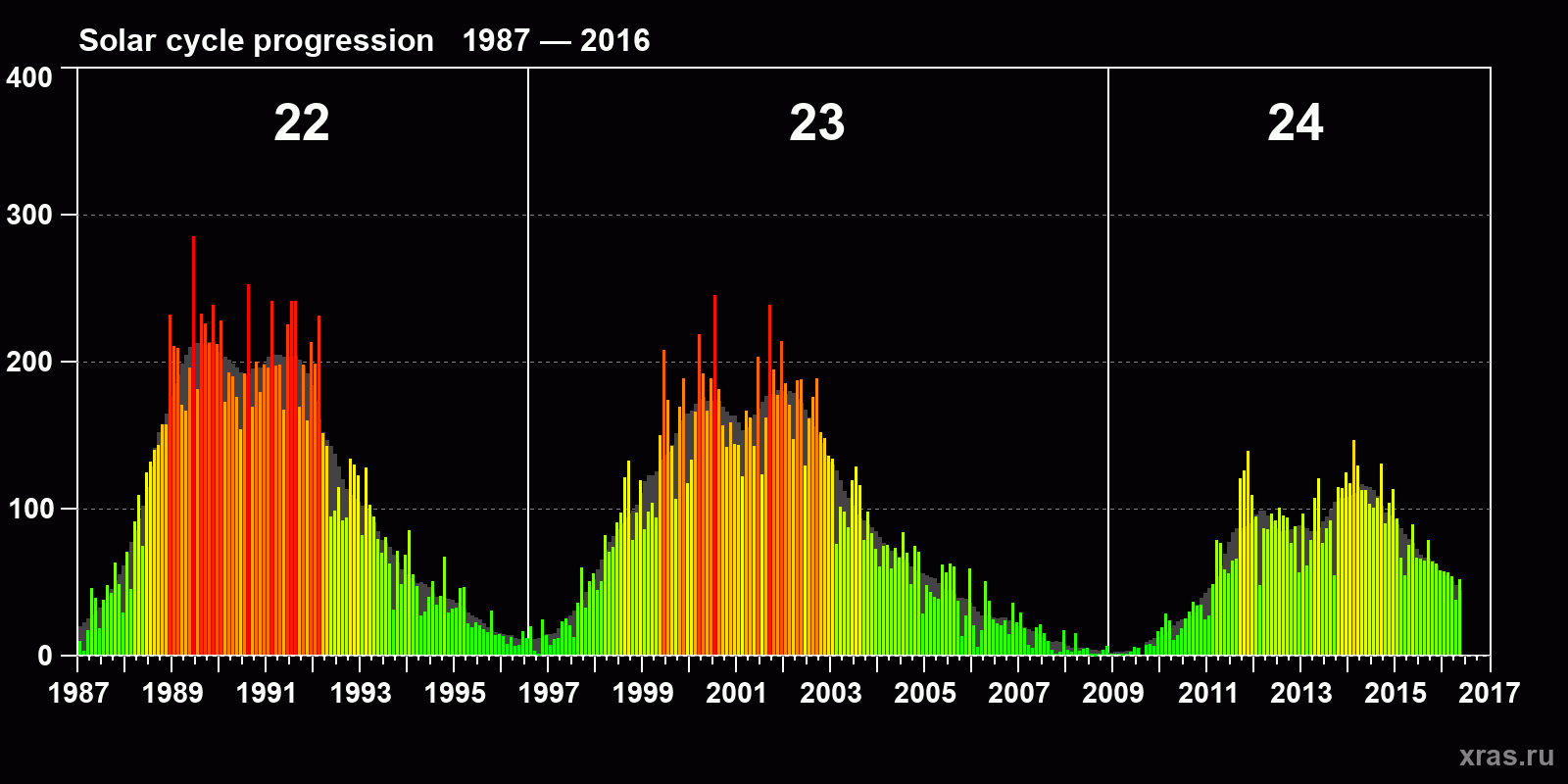 Average monthly sunspot number (SSN) from 1987, January to 2016, May. Gray background - average solar cycle.