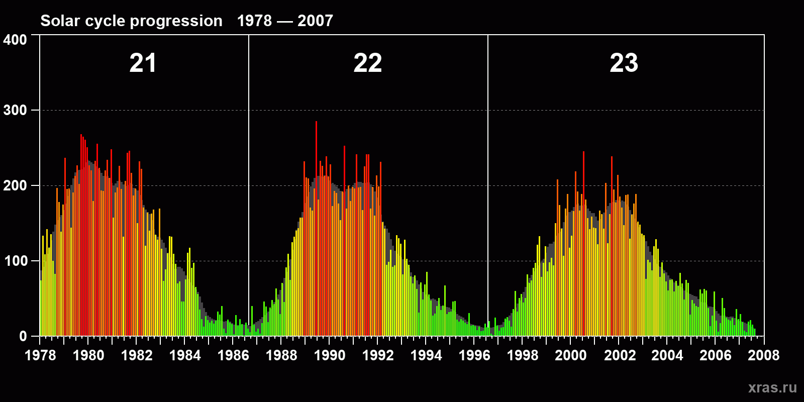 Average monthly sunspot number (SSN) from 1978, January to 2007, August. Gray background - average solar cycle.