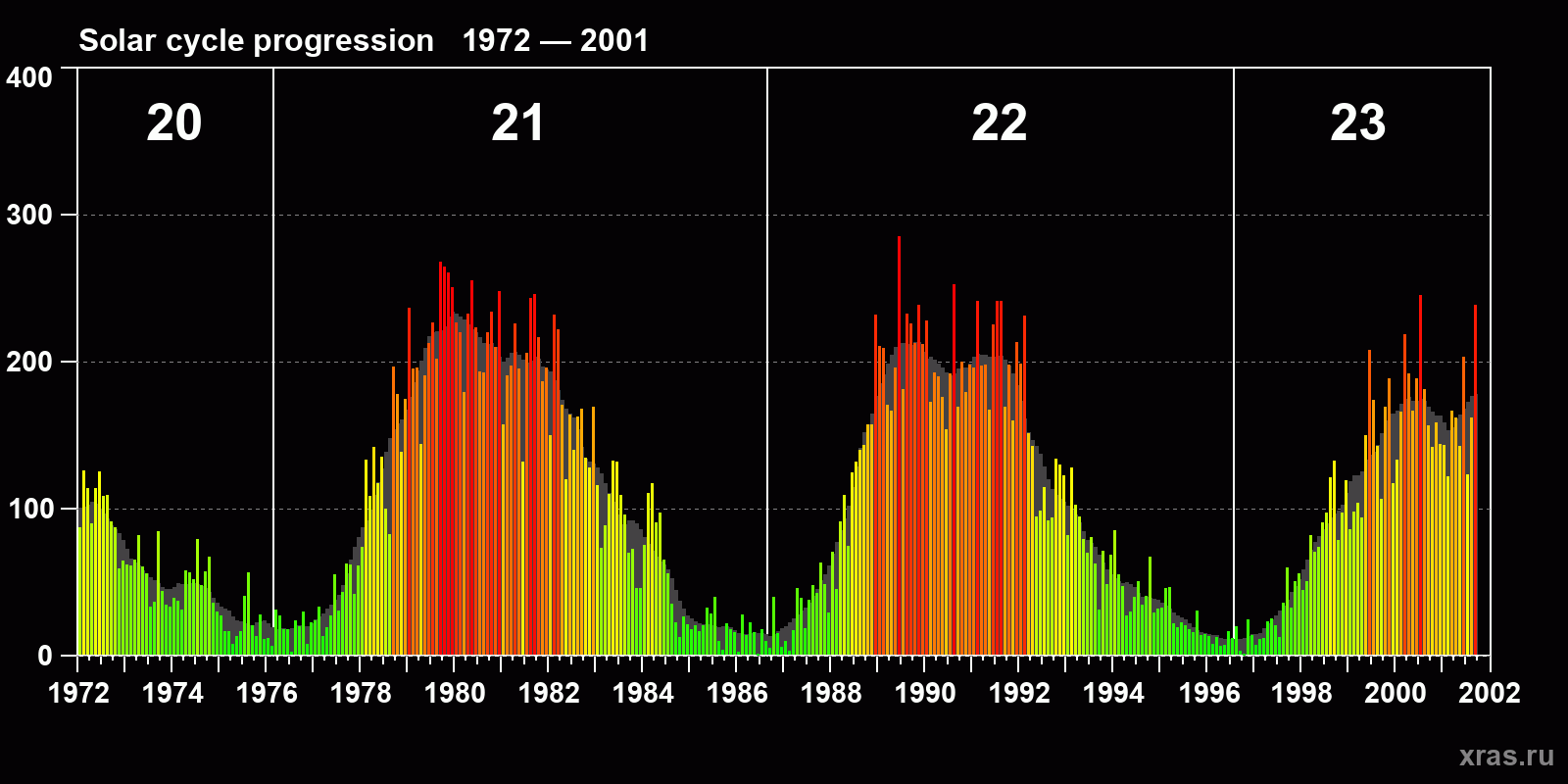 Average monthly sunspot number (SSN) from 1972, January to 2001, September. Gray background - average solar cycle.