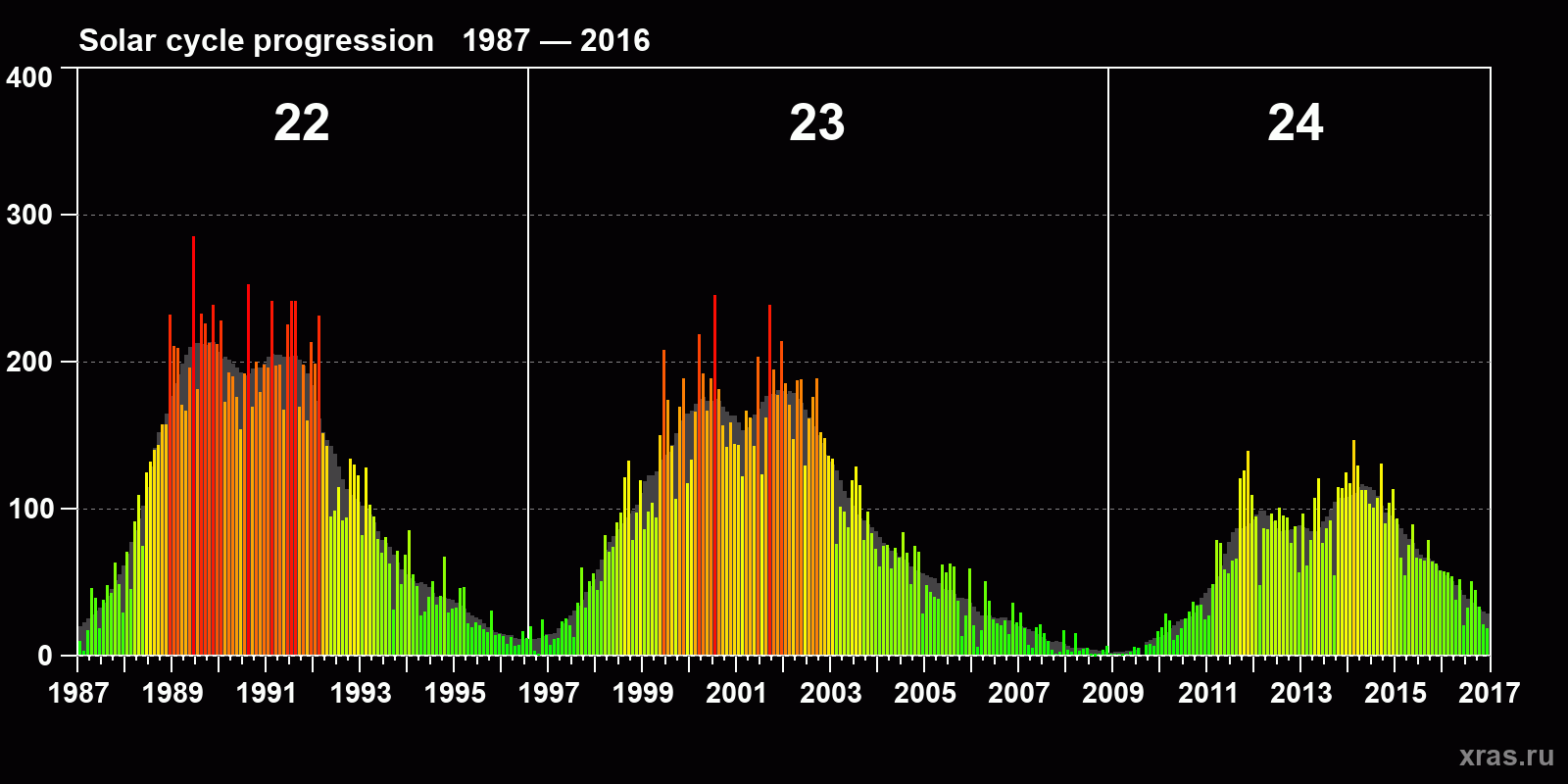 Average monthly sunspot number (SSN) from 1987, January to 2016, December. Gray background - average solar cycle.