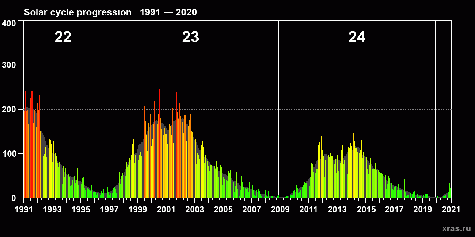 Average monthly sunspot number (SSN) from 1991, January to 2020, December. Gray background - average solar cycle.
