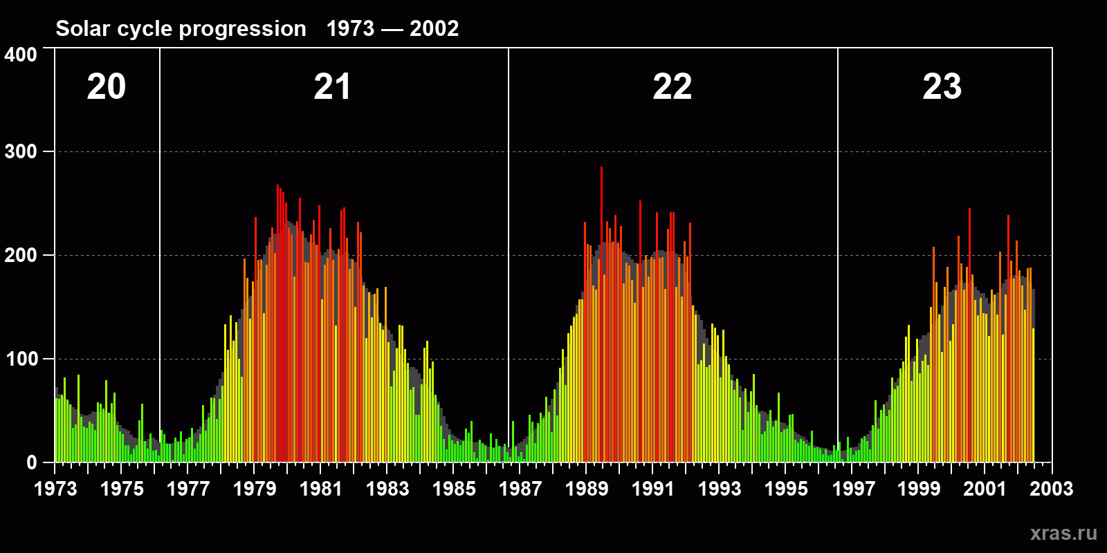 Average monthly sunspot number (SSN) from 1973, January to 2002, June. Gray background - average solar cycle.
