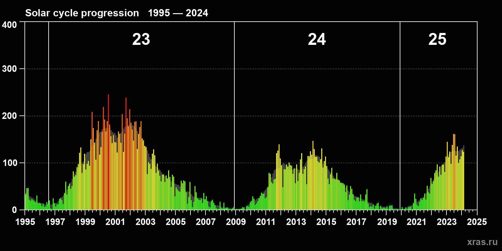 Average monthly sunspot number (SSN) from 1995, January to 2024, February. Gray background - average solar cycle.