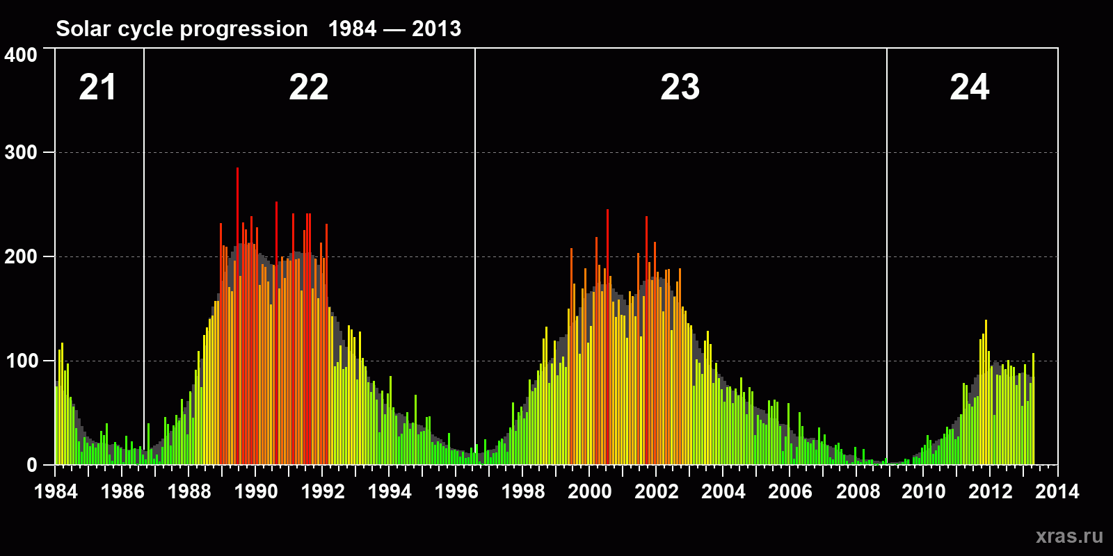 Average monthly sunspot number (SSN) from 1984, January to 2013, April. Gray background - average solar cycle.