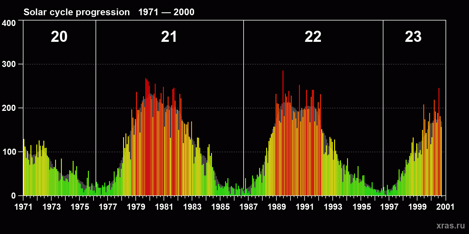 Average monthly sunspot number (SSN) from 1971, January to 2000, September. Gray background - average solar cycle.
