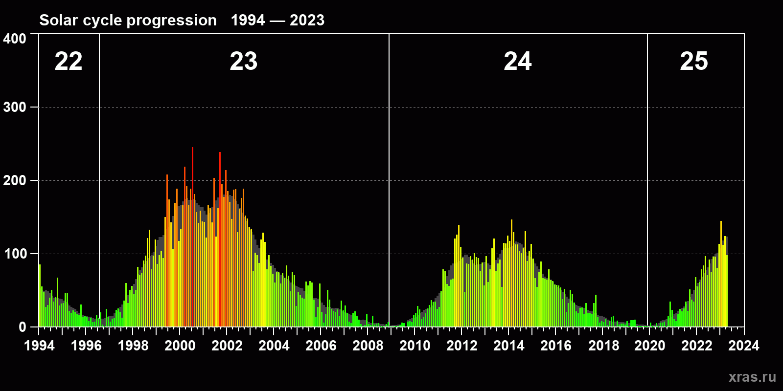 Average monthly sunspot number (SSN) from 1994, January to 2023, April. Gray background - average solar cycle.