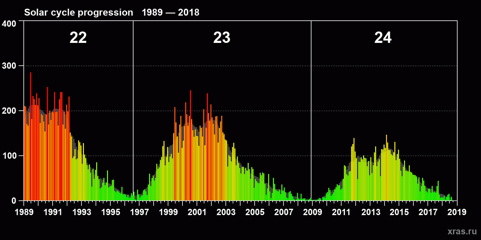 Average monthly sunspot number (SSN) from 1989, January to 2018, August. Gray background - average solar cycle.