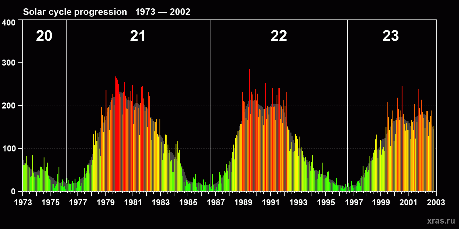 Average monthly sunspot number (SSN) from 1973, January to 2002, October. Gray background - average solar cycle.