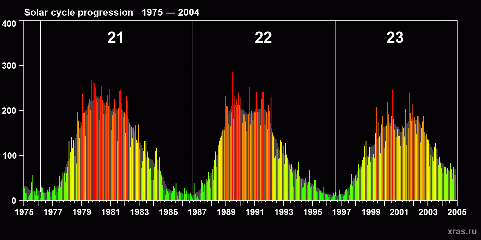Average monthly sunspot number (SSN) from 1975, January to 2004, November. Gray background - average solar cycle.