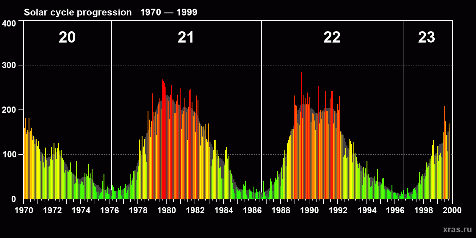 Average monthly sunspot number (SSN) from 1970, January to 1999, October. Gray background - average solar cycle.