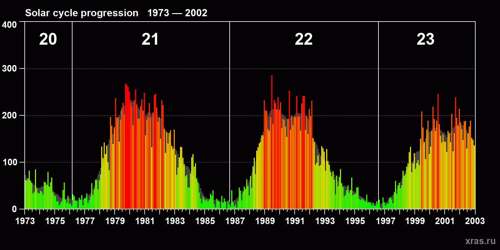Average monthly sunspot number (SSN) from 1973, January to 2002, December. Gray background - average solar cycle.
