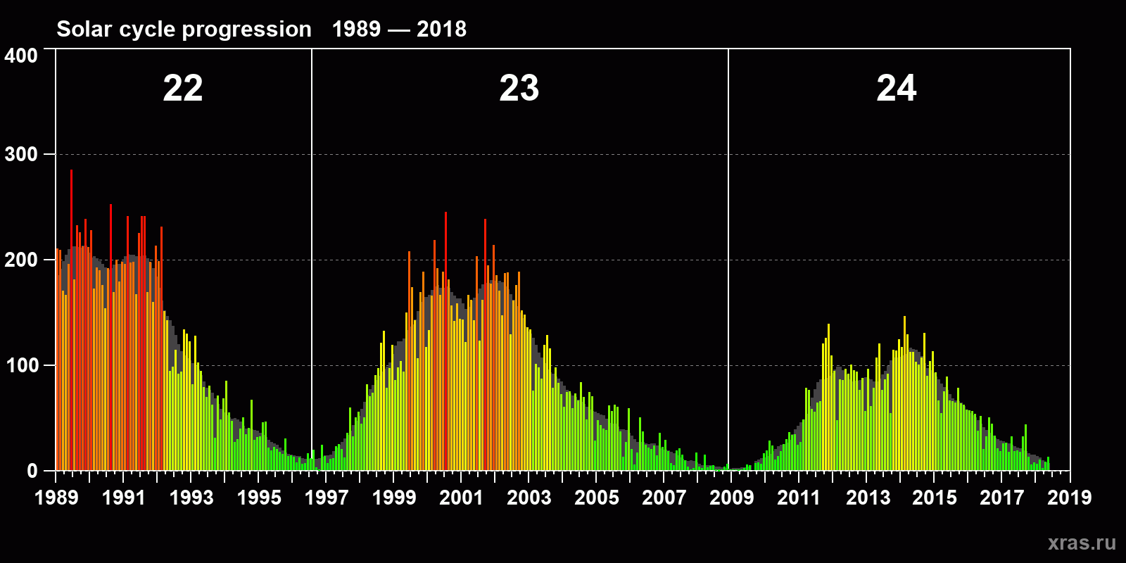 Average monthly sunspot number (SSN) from 1989, January to 2018, May. Gray background - average solar cycle.