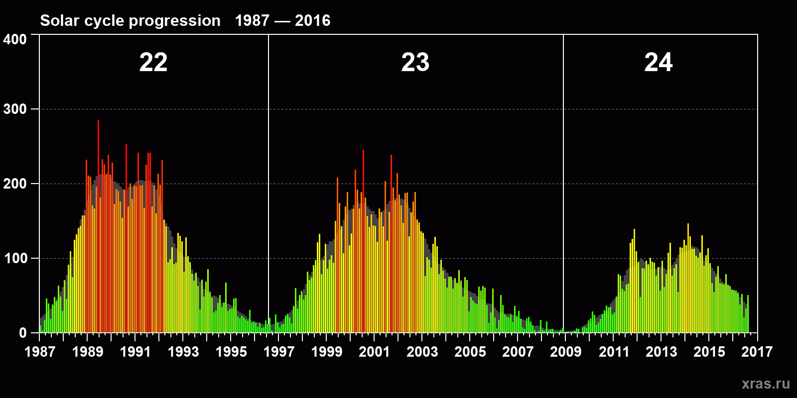 Average monthly sunspot number (SSN) from 1987, January to 2016, August. Gray background - average solar cycle.