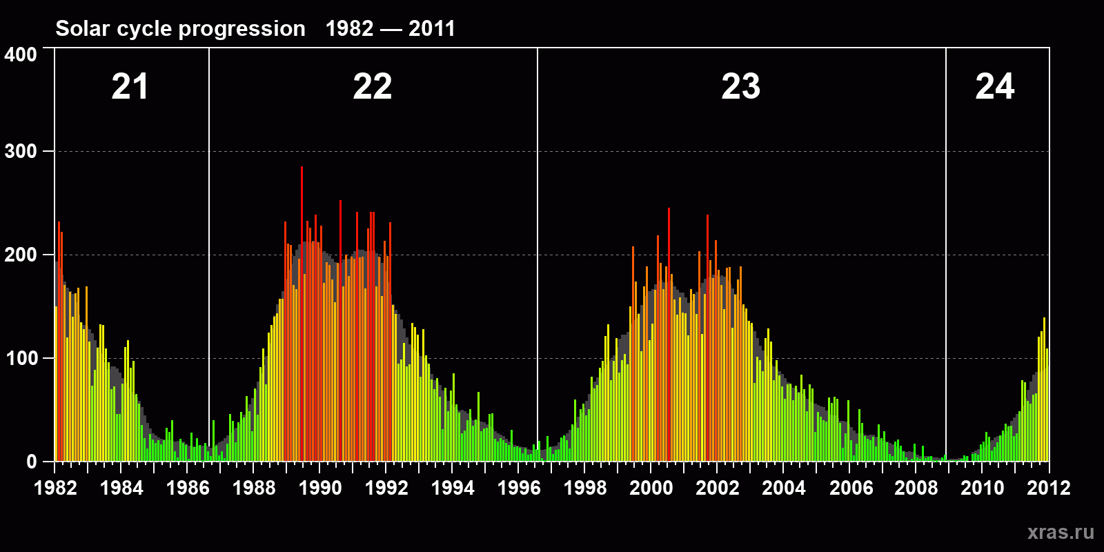 Average monthly sunspot number (SSN) from 1982, January to 2011, December. Gray background - average solar cycle.