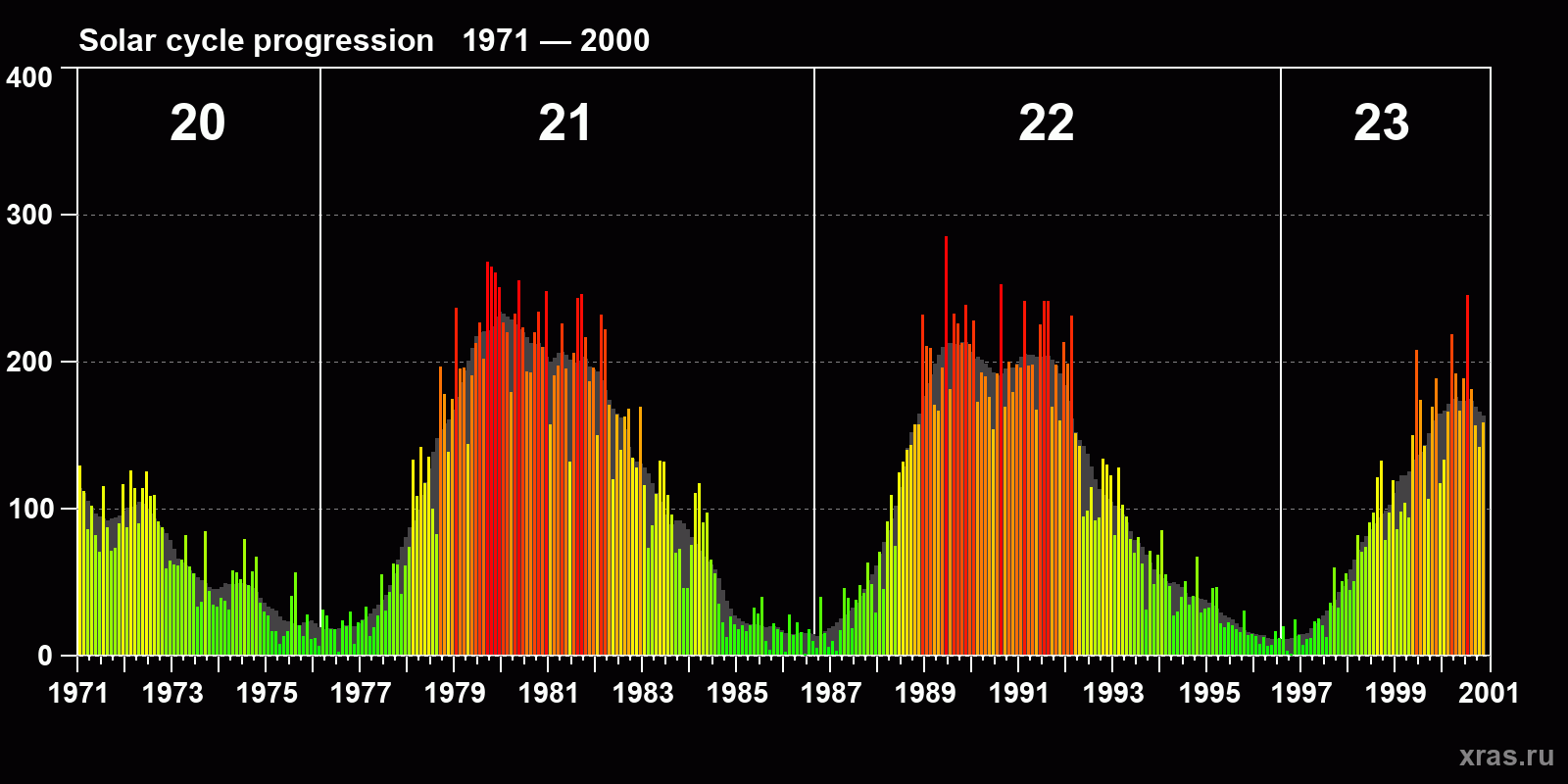 Average monthly sunspot number (SSN) from 1971, January to 2000, November. Gray background - average solar cycle.