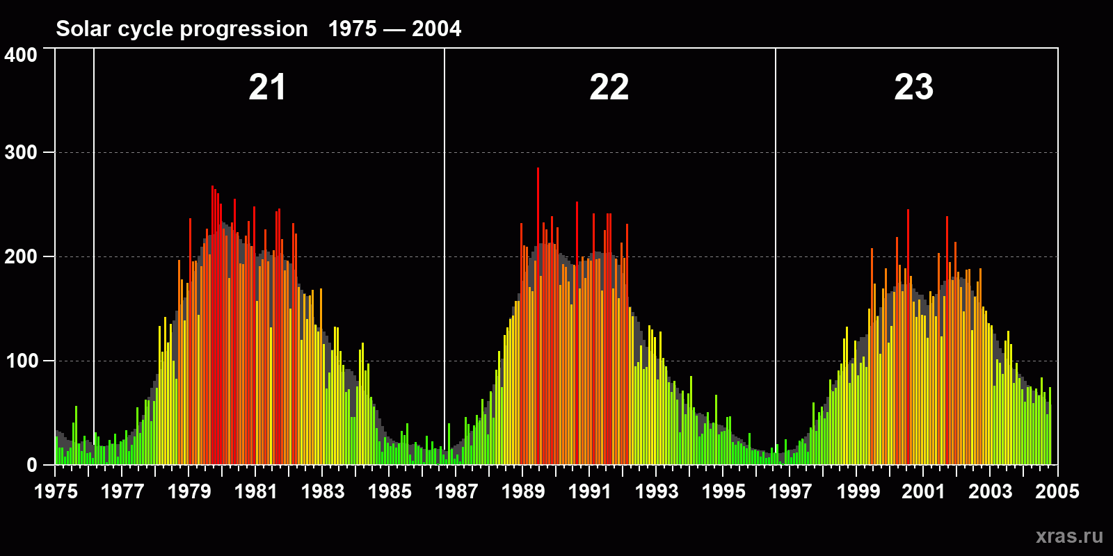 Average monthly sunspot number (SSN) from 1975, January to 2004, October. Gray background - average solar cycle.