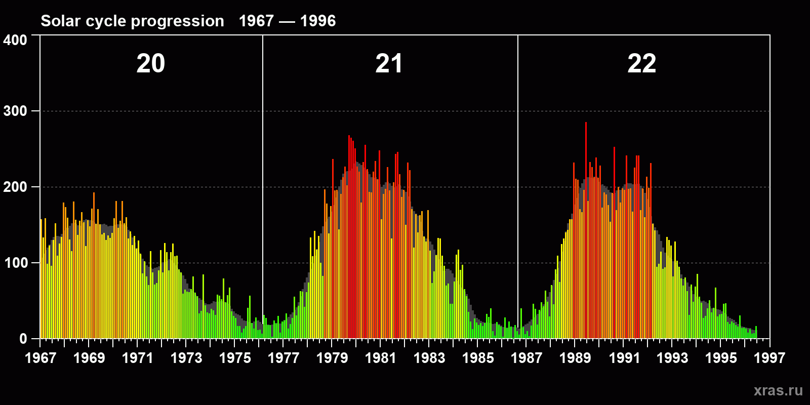 Average monthly sunspot number (SSN) from 1967, January to 1996, June. Gray background - average solar cycle.