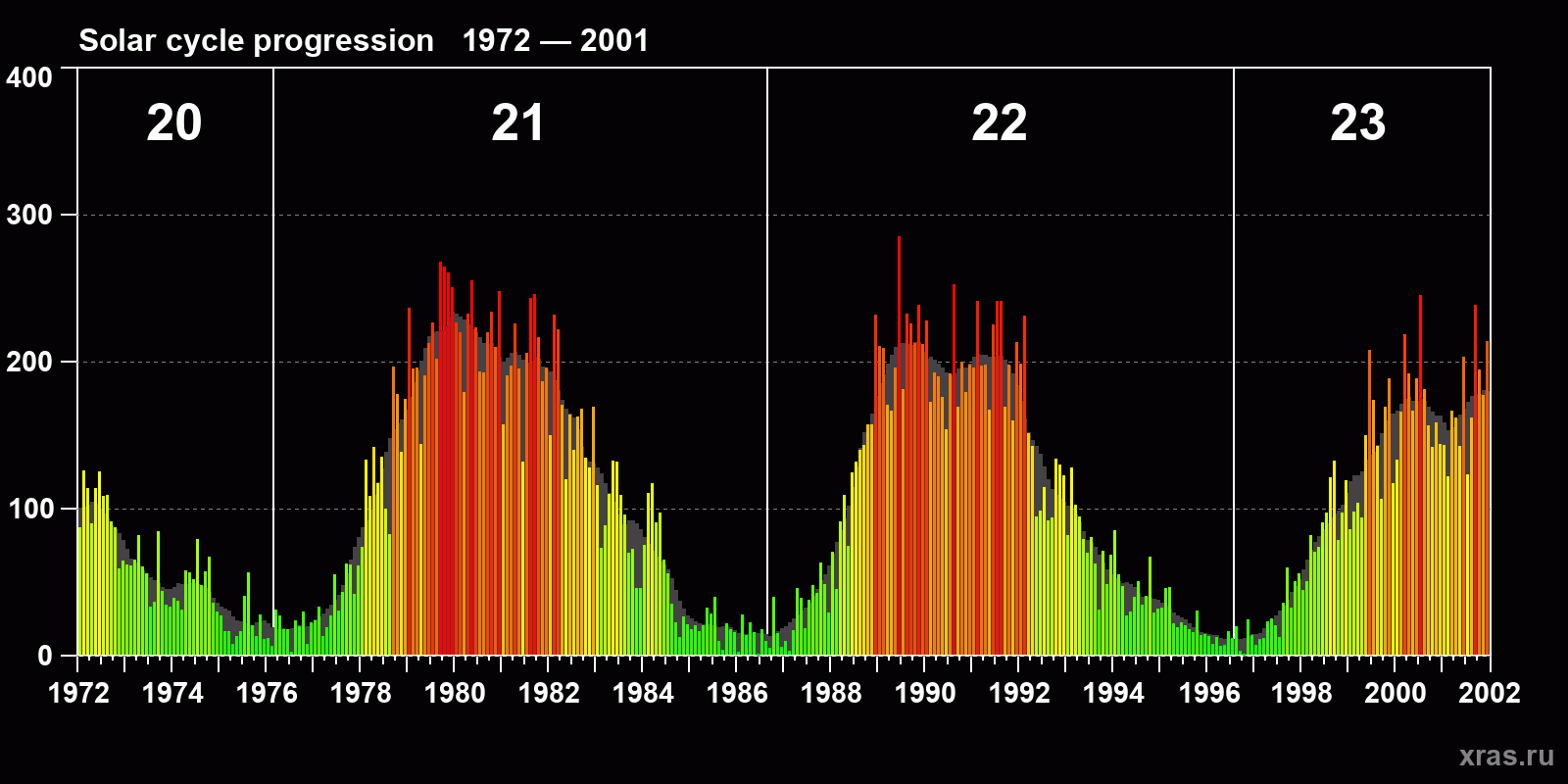 Average monthly sunspot number (SSN) from 1972, January to 2001, December. Gray background - average solar cycle.