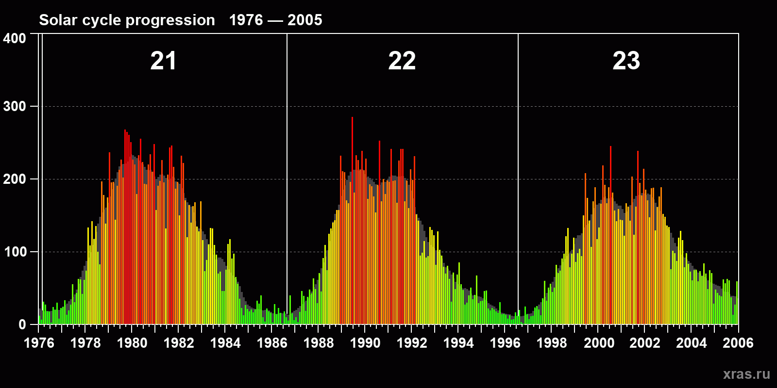 Average monthly sunspot number (SSN) from 1976, January to 2005, December. Gray background - average solar cycle.