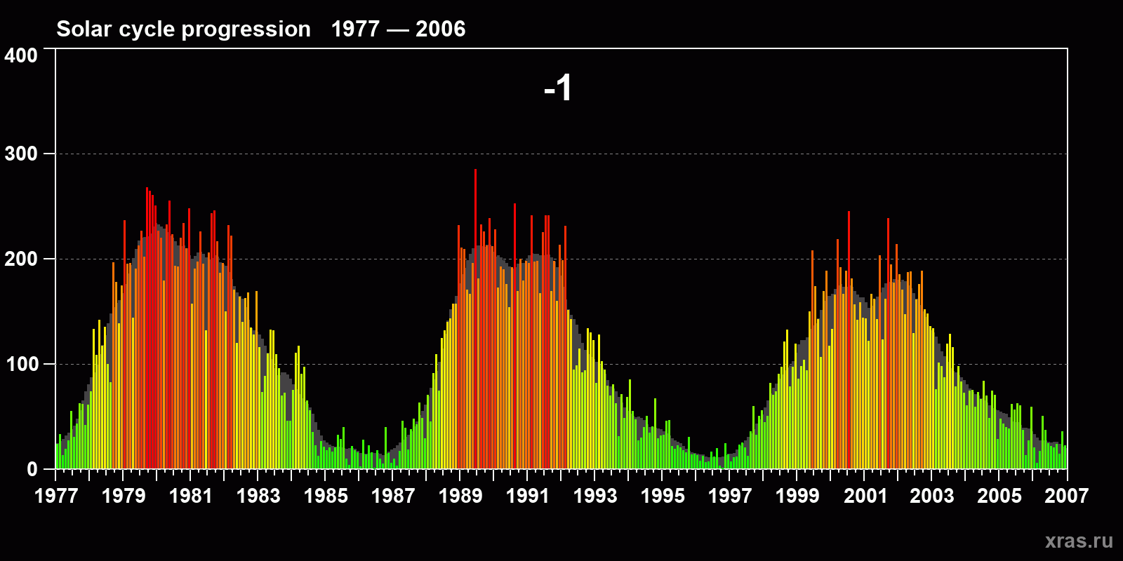 Average monthly sunspot number (SSN) from 1977, January to 2006, December. Gray background - average solar cycle.