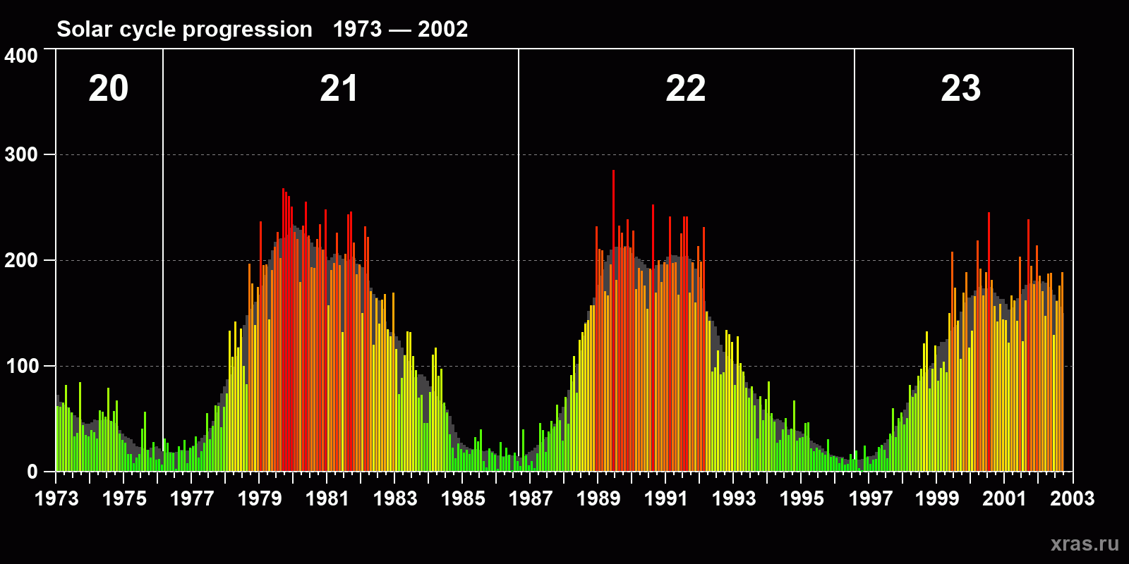 Average monthly sunspot number (SSN) from 1973, January to 2002, September. Gray background - average solar cycle.