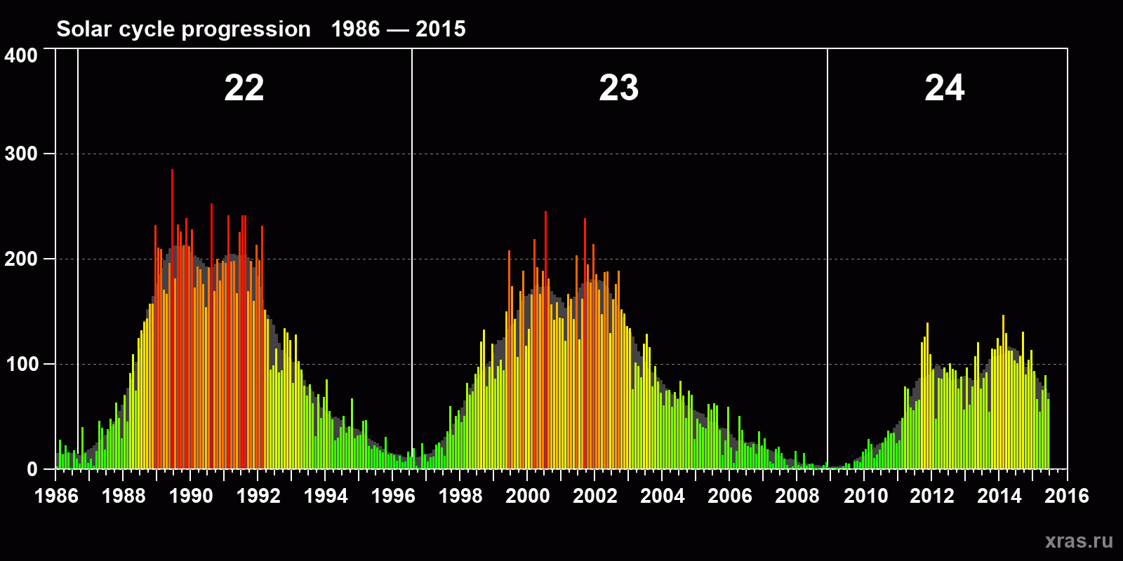 Average monthly sunspot number (SSN) from 1986, January to 2015, June. Gray background - average solar cycle.