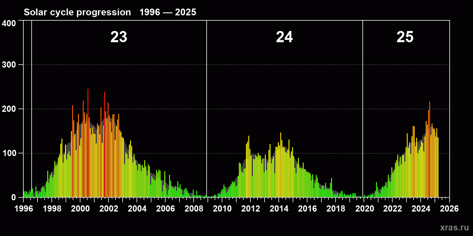 Average monthly sunspot number (SSN) from 1996, January to 2025, March. Gray background - average solar cycle.