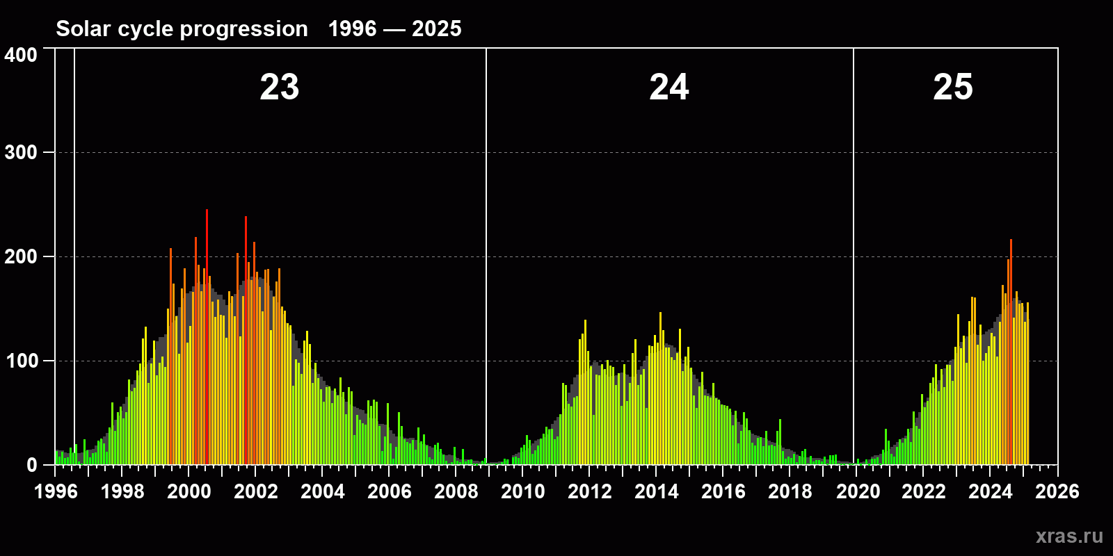 Average monthly sunspot number (SSN) from 1996, January to 2025, February. Gray background - average solar cycle.
